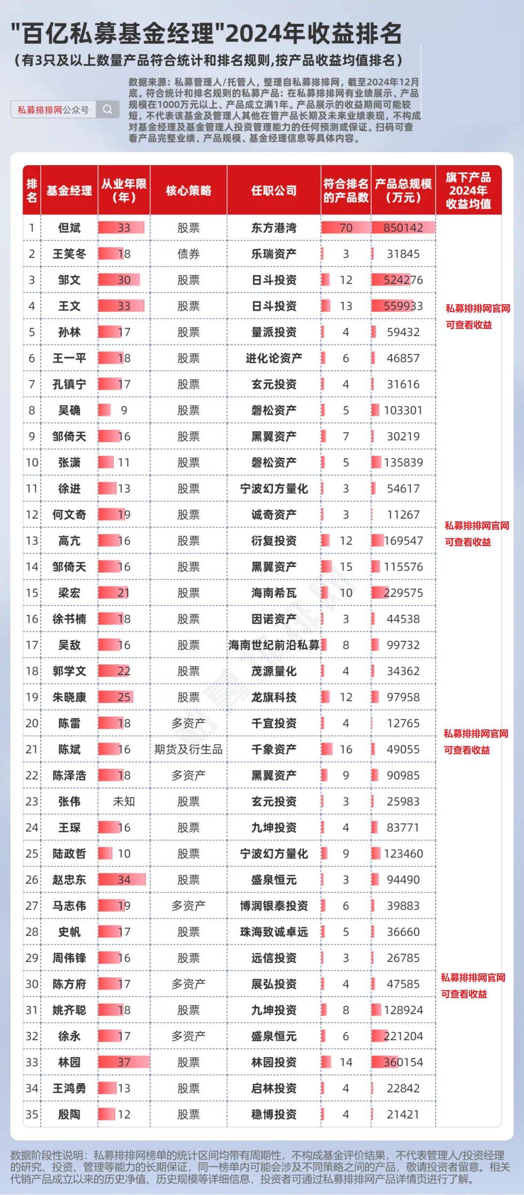 其中,但斌有70只产品在私募排排网有业绩展示且符合排名规则,产品总规模超85亿元,2024年度的收益均值为***%,以较明显优势夺冠!此外,还值得一提的是,但斌旗下有近三年业绩展示的私募产品共有67只,近三年收益均值超***%,在百亿私募基金经理中位居第3!