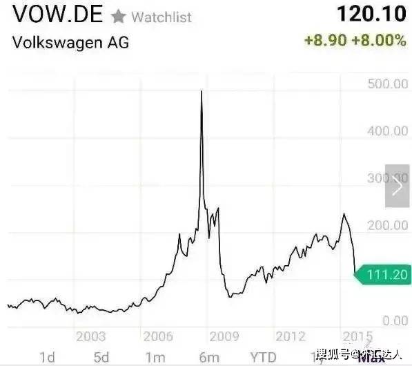 大众公司的股价两天之内暴涨500%,从200欧元暴涨至1005欧元,大众公司的总市值超越当时的埃克森美孚,成为全球第一大公司……