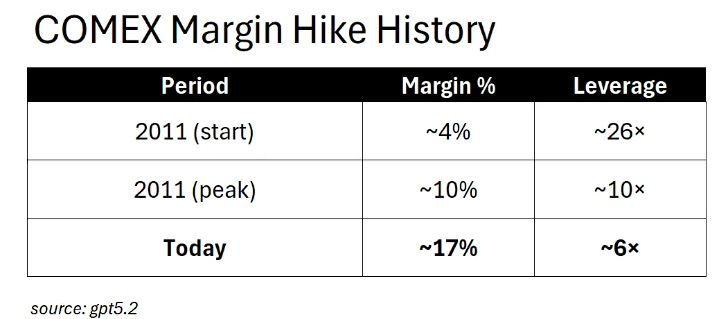 Campbell承认这会降低杠杆和投机需求,但他指出当前保证金水平已达名义价值的17%,远高于2011年银价时的最高水平10%。目前的杠杆倍数仅为6倍,而2011年初曾高达25倍。因此本次保证金上调的冲击远小于2011年的连续加码。