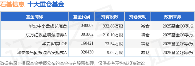 根据2025基金Q3季报公募基金重仓股数据,重仓该股的公募基金共4家,其中持有数量最多的公募基金为华安基金的华安中小盘成长混合。华安中小盘成长混合目前规模为20.0亿元,最新净值3.5411(1月19日),较上一交易日上涨1.2%,近一年上涨25.99%。该公募基金现任基金经理为金拓。金拓在任的基金产品包括:华安智增精选混合,管理时间为2023年10月23日至今,期间收益率为34.65%;华安景气回报混合发起式A,管理时间为2024年9月19日至今,期间收益率为36.89%;