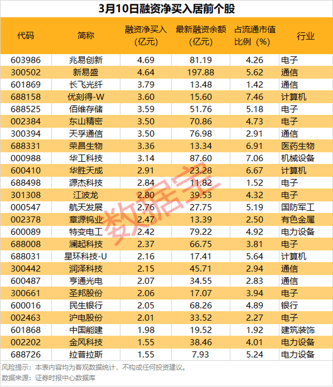 具体到个股,3月10日共有1977股获融资净买入,净买入金额在1亿元以上的有45股,其中9股融资净买入额均超3亿元。