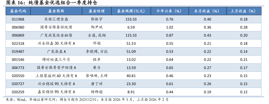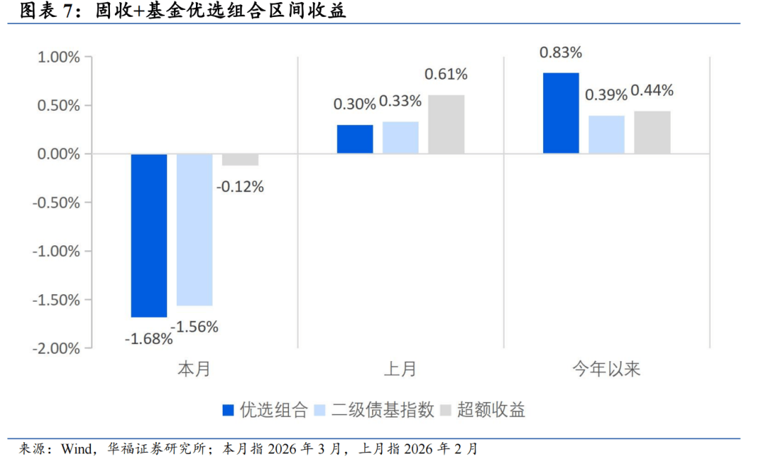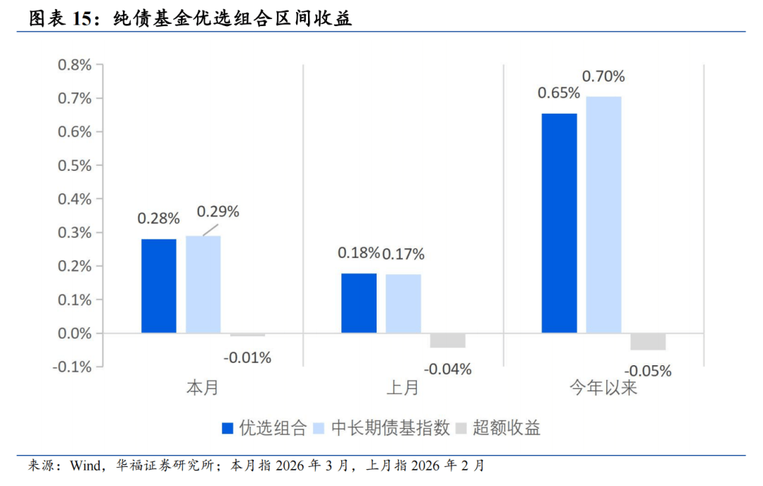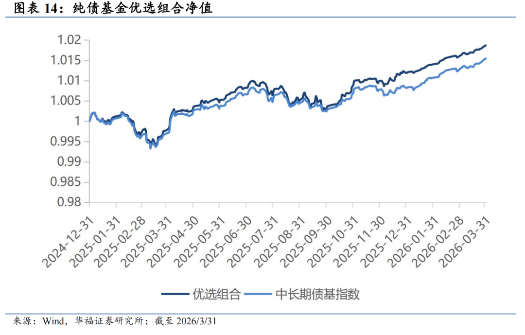 我们在各项风格暴露均在市场平均水平上下一倍标准差的基金池中,季频选择特质收益Alpha较高的十只基金等权配置,构建纯债基金优选组合。从净值表现来看,纯债基金优选组合3月区间收益为0.28%,跑输中长期纯债基金指数0.01%。3月末我们在约束风险暴露的前提下根据纯债基金获取Alpha的能力筛选出2026年二季度纯债基金持仓,其中今年以来表现较好的持仓产品有华富恒稳纯债A、南方华元A等。