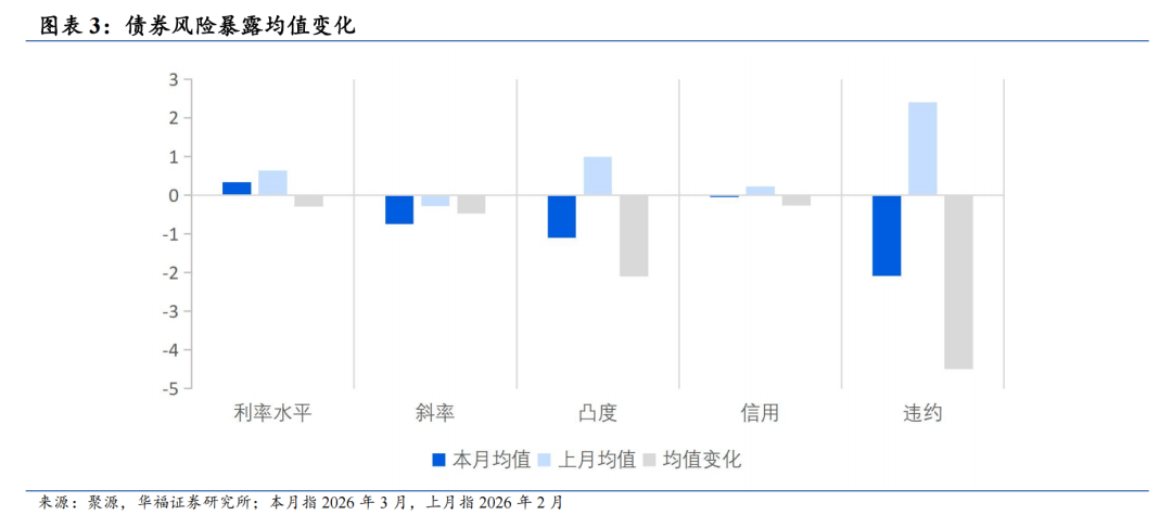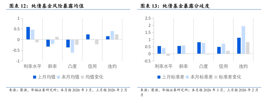 我们将纯债基金净值对利率水平、斜率、凸度、信用和违约五个因子回归得到每只纯债基金的风险暴露。从暴露的均值变化来看,3月相较上月纯债基金整体在久期暴露上有所下调,同时下调了信用因子暴露。从暴露的分歧度来看,在信用和违约上的分歧度有所上升。