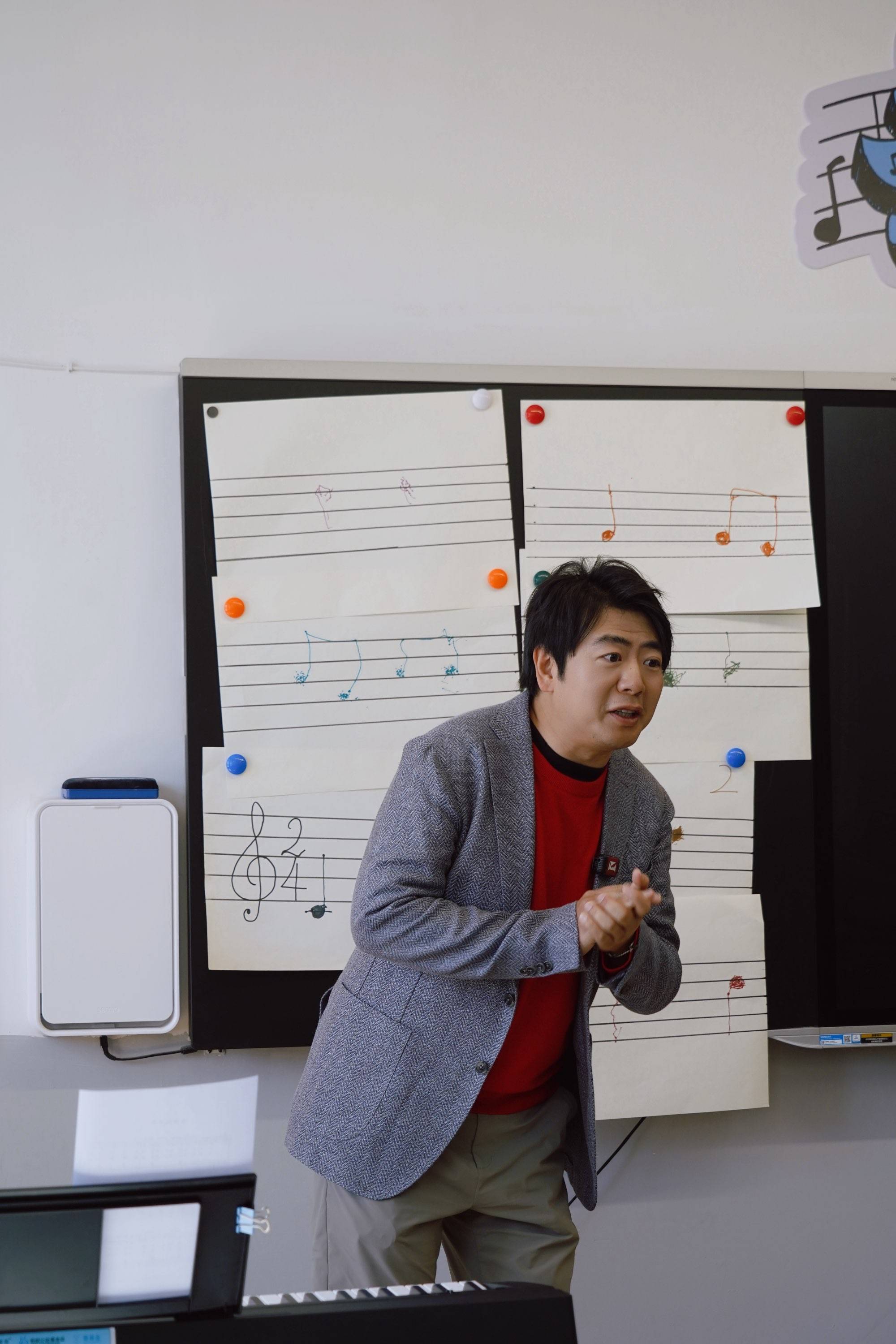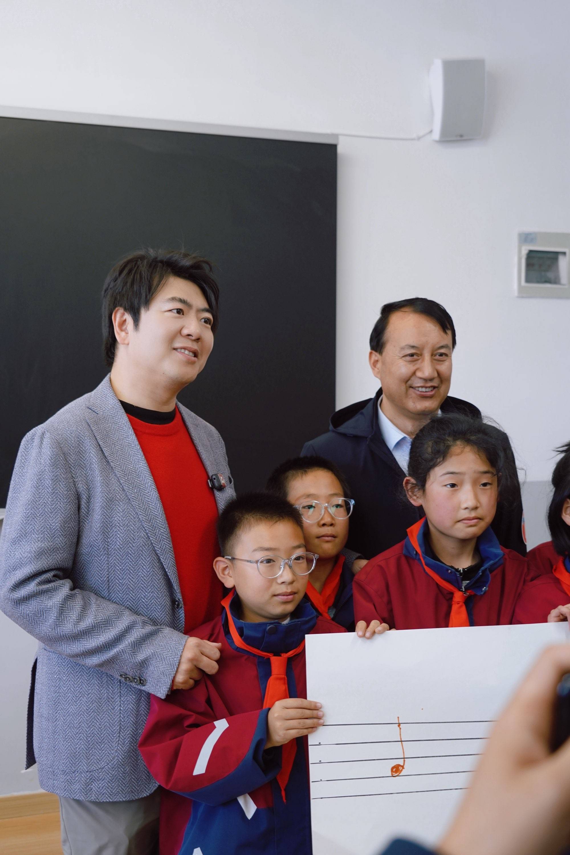 当天下午,郎朗与慈善伙伴来到积石山县大河家小学,当郎朗走进音乐教室,孩子们热烈的掌声与欢呼声瞬间响起。面对许多从未学过钢琴的孩子,郎朗耐心地现场教学。他先和孩子们一起在纸上画出五线谱,随后坐回钢琴前,将大家刚刚画下的音符即兴弹奏成一段美妙的旋律,让孩子们直观地感受到“纸上音符变音乐”的神奇。