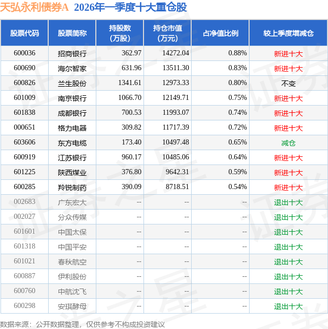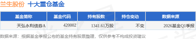 根据2026基金Q1季报公募基金重仓股数据,重仓该股的公募基金共1家,其中持有数量最多的公募基金为天弘基金的天弘永利债券A。天弘永利债券A目前规模为16.27亿元,最新净值1.2473(4月23日),较上一交易日上涨0.04%,近一年上涨5.01%。该公募基金现任基金经理为张寓 杜广。杜广在任的基金产品包括:天弘添利债券(LOF)C,管理时间为2019年11月15日至今,期间收益率为61.42%;天弘弘丰增强回报债券A,管理时间为2020年7月25日至今,期间收益率为35.19%;天弘多元收益债券A,管理时间为2020年10月29日至今,期间收益率为39.86%;天弘新价值混合A,管理时间为2022年1月21日至今,期间收益率为20.05%。张寓在任的基金产品包括:天弘增强回报债券A,管理时间为2020年7月17日至今,期间收益率为34.13%;天弘永利优佳混合A,管理时间为2021年9月29日至今,期间收益率为9.06%;天弘永利优享债券A,管理时间为2022年8月30日至今,期间收益率为14.49%。