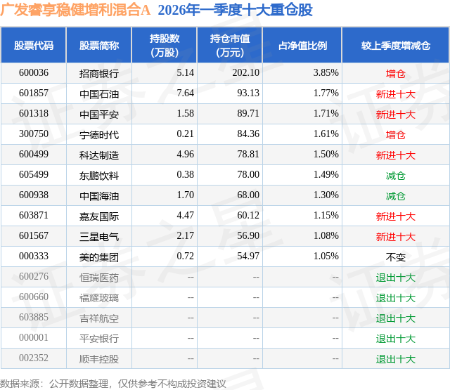 从基金规模来看,广发睿享稳健增利混合A基金2026年一季度公布的基金规模为0.52亿元,较上一期规模9180.51万元变化了-3952.88万元,环比变化了-43.06%。该基金最新一期资产配置为:股票占净值比33.4%,债券占净值比63.96%,现金占净值比2.98%。从基金持仓来看,该基金当季前十大股票仓位达16.51%,第一大重仓股为招商银行(600036),持仓占比为3.85%。