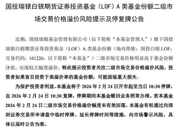 公告称,近期,国投瑞银基金管理有限公司(以下简称“本基金管理人”)旗下国投瑞银白银期货证券投资基金(LOF)A 类基金份额(场内简称:国投白银LOF;交易代码:161226,以下简称“本基金”)二级市场交易价格明显高于基金份额净值,出现较大幅度溢价。特此提示投资者关注二级市场交易价格溢价风险,投资者如果盲目投资于高溢价率的基金份额,可能面临重大损失。为保护投资者利益,本基金将于 2026 年 2 月 24 日开市起至当日10:30 停牌,自 2026 年 2 月 24 日 10:30 复牌,停牌期间本基金赎回业务照常办理。若本基金2026 年 2 月 24 日二级市场交易价格溢价幅度未有效回落,本基金有权通过向深圳证券交易所申请盘中临时停牌、延长停牌时间等措施,向市场警示风险,具体以届时公告为准。